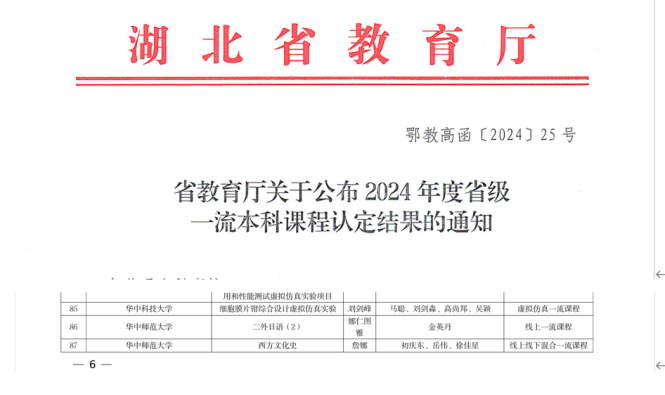 2024/11近日,湖北省教育厅发布《省教育厅关于公布2024年度省级一流本科课程认定结果的通知》(鄂教高函〔2024〕25号),正式公布2024年度省级一流本科课程认定结果,公司《西方文化史》课程获批认定为省级线上线下混合一流课程。《西方文化史》课程由公司詹...