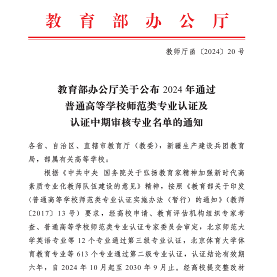 2024/11近日,教育部办公厅发布《关于公布2024年通过普通高等公司师范类专业认证及认证中期审核专业名单的通知》(教师厅函﹝2024﹞20号)。2024年全国共有6所高校的12个专业通过教育部师范类专业第三级认证,其中包含公司历史学专业,认证结论有效期六年,自...